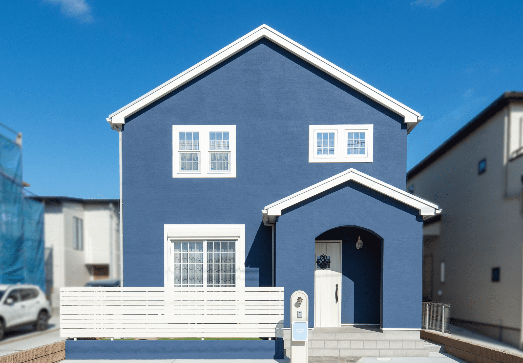 切妻屋根のすっきりとしたフォルムに、コバルトブルーの外壁で爽やかな印象のお家。